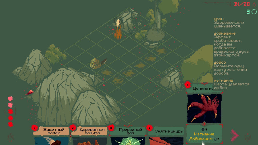 Сами сражения непохожи на то, что мы видели в Slay the Spire и Black Book. Тут есть, конечно, черты, свойственные ККИ, включая лимит маны и принципы работы многих карт. Но при этом перед нами полноценная пошаговая тактика в духе Into the Beach, где важно грамотно перемещать и располагать бойцов, а также отталкивать/сталкивать врагов как друг с другом, так и с окружением.