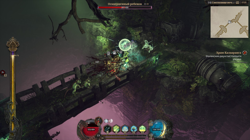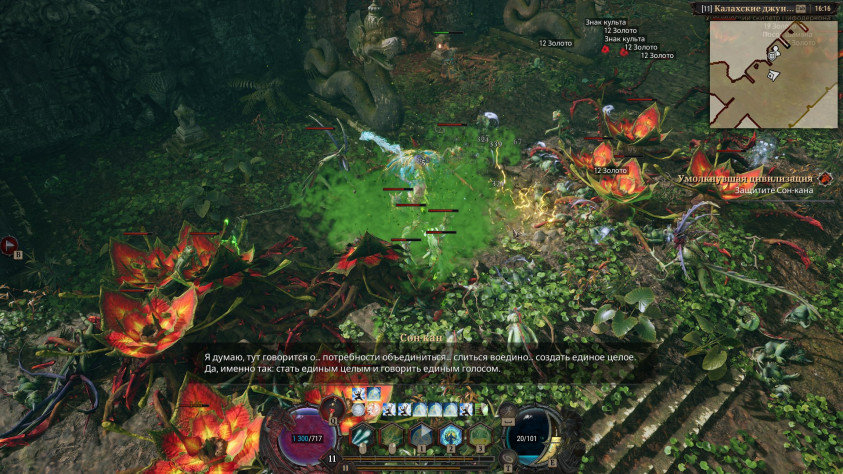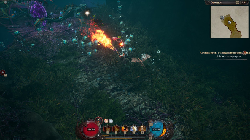 Мы постоянно разбираем на атомы толпы монстров, которые с разницей в секунду или одновременно нападают со всех направлений. А когда при этом издали нас отравляют и атакуют корнями какие-то мерзкие растения, способные за пару секунд сточить всё здоровье, становится совсем жарко. То и дело встречаются элитные враги, которые в разы сильнее остальных, могут превращать нашего героя в камень или даже «ваншотить» — некоторых вообще непонятно как убивать, и приходится просто драпать.