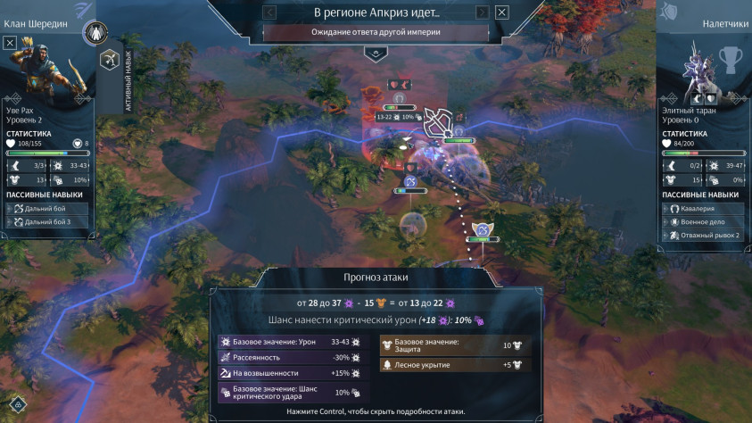 Особенности фракций влияют и на сражения. Так, бойцы клана Шередин пользуются щитами, тогда как Аспекты получают бонус к урону. Как и раньше, в боях многое определяет тип местности (он зависит от того, на каком гексе была инициирована драка), но сами битвы изменились. Механика непрямых приказов сменилась классической и куда более управляемой пошаговой системой, которую Amplitude уже использовала в Humankind. Прямой контроль над юнитами, у которых есть уникальные особенности, и активное использование умений героев дали сражениям больше контроля и динамики, а игрокам — больше понимания, что подопечные будут делать именно то, чего от них хотят.