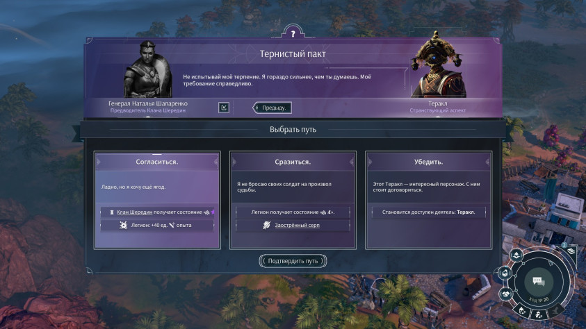 Но вопросы к интерфейсу и удобству навигации остались. А ещё они возникают к механике районов и к дипломатии. Например, я так и не понял, почему для прохода на территорию, где расположена квестовая локация, мне пришлось копить влияние и объявлять войну той фракции, с которой я вовсе не планировал ссориться и даже заключил выгодное научное соглашение.