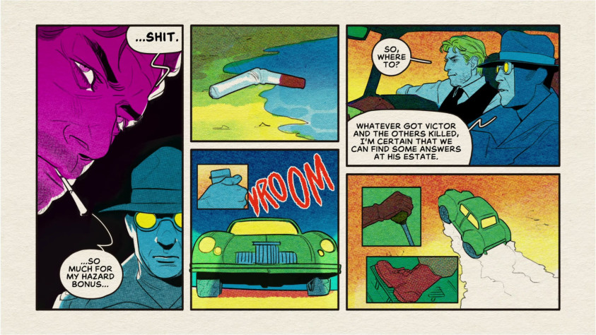 Естественно, в рамках доступного первого эпизода выяснить, что происходит, не удаётся. Эпизод оставляет немалую интригу на будущее, в очередной раз убеждая в справедливости известной фразы про “ищите женщину”. И всё это сопровождается сочными диалогами и выразительно озвученными комиксами.