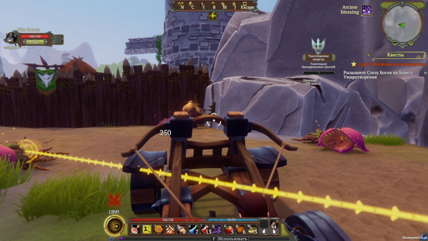 Испанский стыд, недоумение и смех вызывает дизайн некоторых заданий. Например, в событии, где стражники бьются с гоблинами, нас, судя по описанию, ждёт много интересных занятий — нужно возводить лагерь, строить баллисты и стрелять из них по огромным цветам, закапывать норы, откуда прут гоблины, и поджигать вражескую базу. Но боже, как же всё на данный момент убого, медленно, скучно и криво. До конца я это выдержал только из научного интереса и ради гринда — во втором доступном регионе планка сложности довольно резко и не совсем адекватно подскакивает. Геймплей в данном событии напоминает пособие, как делать не надо.