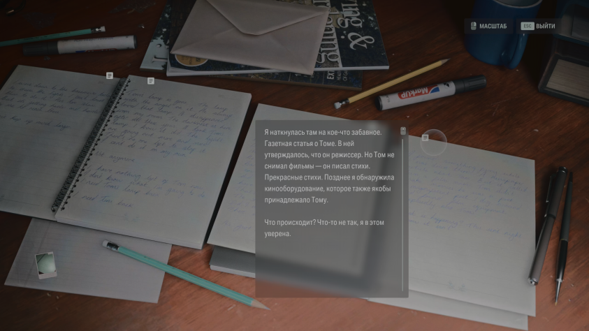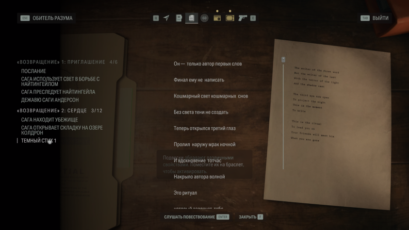 Напомню, что для открытия складки нужны два компонента — какое-нибудь мрачное убийство, легенда или история, а также произведение искусства. Сага, например, открыла складку у колодца Хуотари, куда по легенде маньяк сбрасывал трупы, а подкрепила свой ритуал выставочным стендом — тоже своего рода искусство. Алану в это же время предстояло идти по следам убийств культа, а проводником в складку ему служили стихи, начертанные в местах, которые соприкасались с реальным миром.