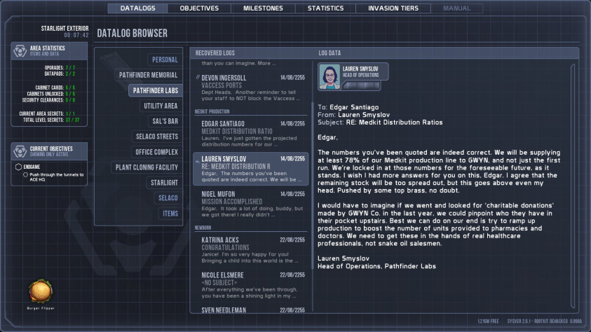 Аналогично неуклюже обстоят дела со сценарием. Страница в Steam пафосно обещает сюжетный FPS, однако без подсказки свыше о существовании нарратива и не догадаешься: штрихпунктирная история без внятных персонажей, конфликтов и даже намёка на драматургию излагается лишь через валяющиеся под ногами КПК. Понятно, что AOS надеялась сделать реверанс в сторону дилогии System Shock, но, увы, она наступила на те же грабли, что и авторы Doom 3: разменяла редкие, но важные сообщения на тонну бессмысленной дряни из рабочих переписок. Впрочем, сравнение слегка несправедливое: в противоречивом хорроре id хотя бы есть центральный антагонист.