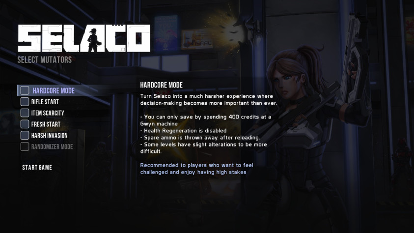 Помимо джентльменского набора уровней сложности в Selaco есть уникальные модификаторы. Хардкорный режим, например, разрешает сохраняться только в автоматах GWEN, где обычно можно закупиться аптечками или взять апгрейд для кулаков.