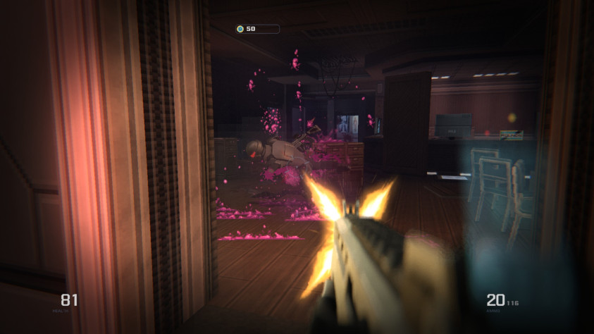 Интерактивное окружение, которое поначалу видится неоспоримым достоинством, тоже теряет вау-эффект и начинает казаться откровенно лишним — да, картины можно поправлять, свет дают включать-выключать, но толку от большей части таких деталей нет. Приятно, что многие предметы функционируют как подобает, но вот бы ещё в них был какой-то смысл: скажем, темень бы сказывалась на меткости противников. В какой-то момент крепнет странное подозрение, будто многое в Selaco замышлялось ради лайков и мемов, как позёрства для ценителей красивых мелочей. «Вау, тут можно не только отстреливать головы, но ещё и устраивать матчи в кривой аэрохоккей, есть пиццу и спасать рыбок из протекающего по законам физики аквариума!»
