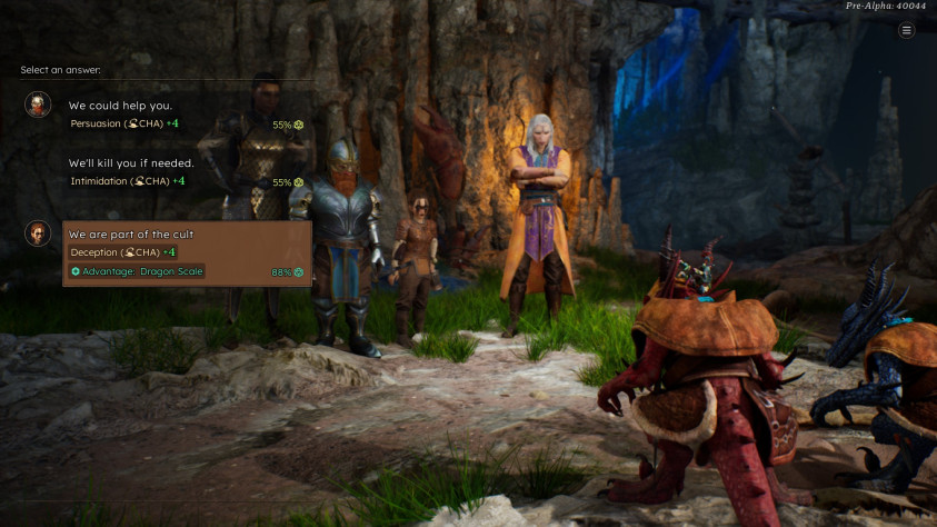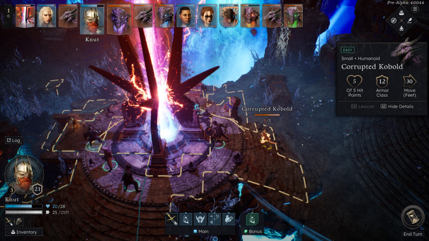 Вскоре в пещере мы находим персонажа, о пропаже которого говорила Элли, — его заперли в клетке и держат в плену кобольды, которые, кажется, поклоняются дракону и хотят принести пленника ему на обед, чтобы ящер успокоился. И вот тут начинаются самые интересные вещи. Мы можем вступить в открытый бой с кобольдами, попытаться договориться или сначала персонажем-плутом, отделённым от партии, найти у них на территории нужную вещь и потом уже попытаться договориться — в последнем случае шансов будет больше, потому что мы сможем прикинуться своими, то есть членами драконьего культа. К тому же если сойдём за культистов, то в финальной битве, которой заканчивается демо, несколько кобольдов придут к нам на помощь — а это, поверьте, очень кстати.